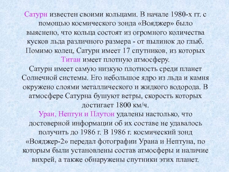 Уран, Нептун и Плутон удалены настолько, что достоверной информации об их составе не удавалось получить до 1986 г. В 1986 г. космический зонд «Вояджер-2» передал фотографии Урана и Нептуна, по которым были установлены состав атмосферы и наличие вихрей, а также обнаружены спутники этих планет.