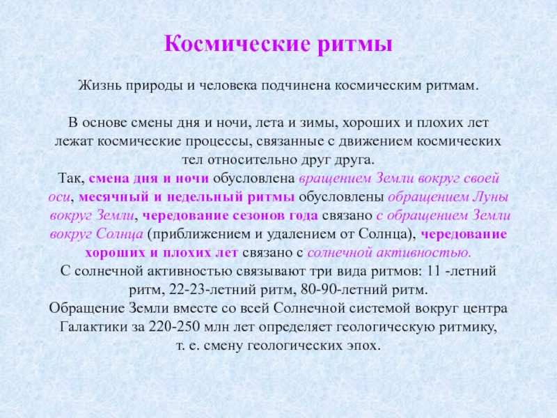 Жизнь природы и человека подчинена космическим ритмам.