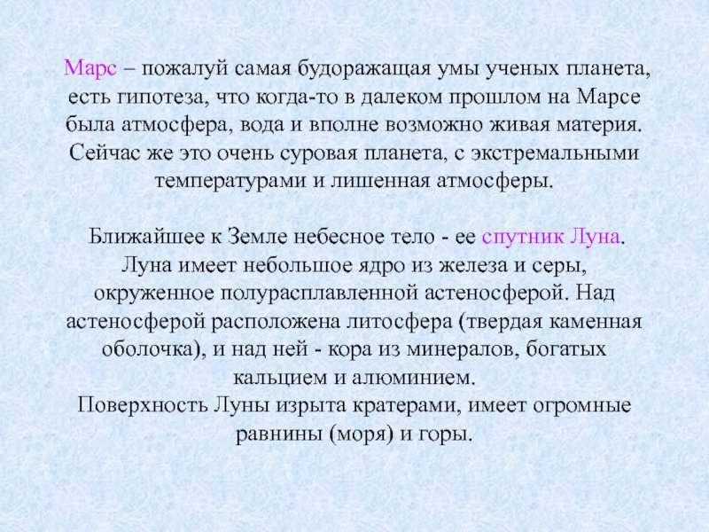 Слайд 7Марс – пожалуй самая будоражащая умы ученых планета, есть гипотеза,