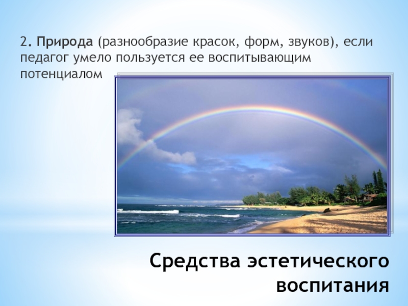 Средства эстетического воспитания2. Природа (разнообразие красок, форм, звуков), если педагог умело пользуется ее воспитывающим потенциалом