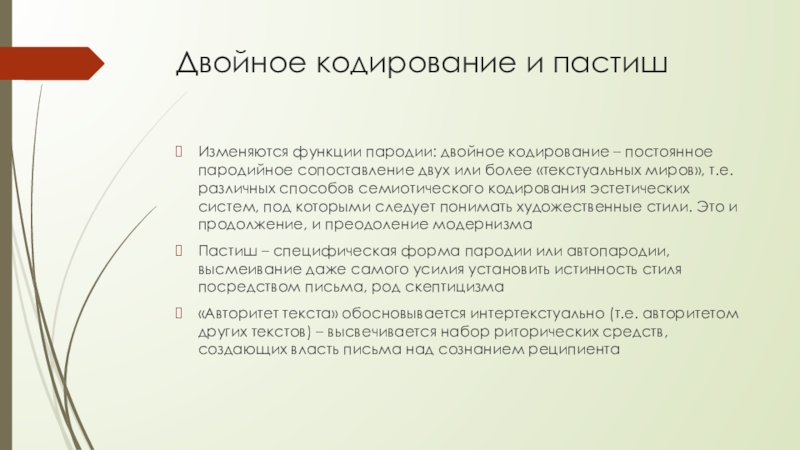 Пастиш – специфическая форма пародии или автопародии, высмеивание даже самого усилия установить истинность стиля посредством письма, род скептицизма