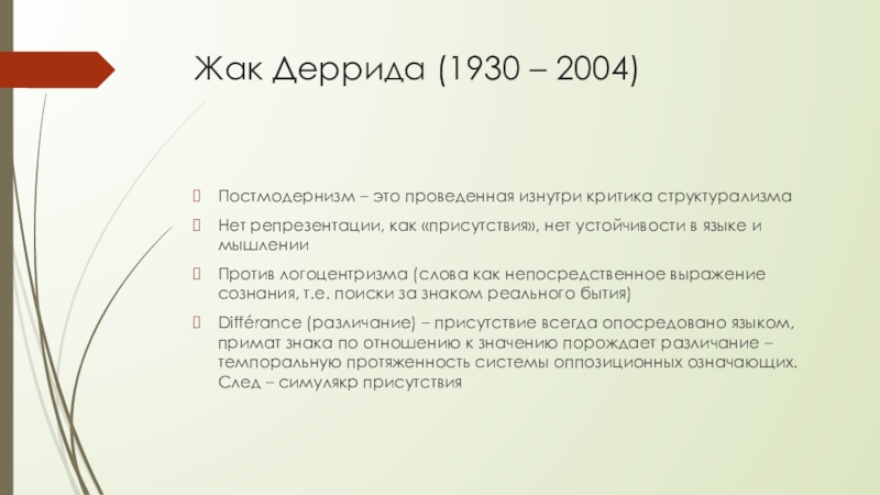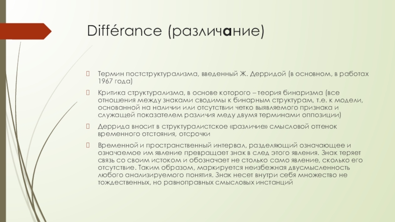 Деррида вносит в структуралистское «различие» смысловой оттенок временного отстояния, отсрочки