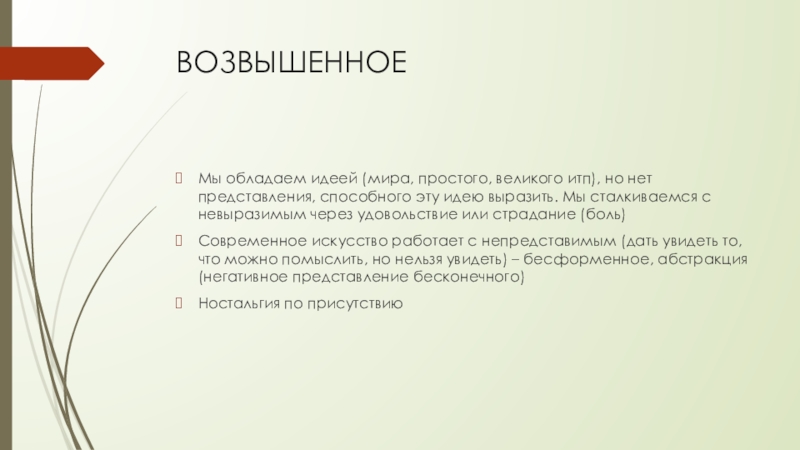 Современное искусство работает с непредставимым (дать увидеть то, что можно помыслить, но нельзя увидеть) – бесформенное, абстракция (негативное представление бесконечного)