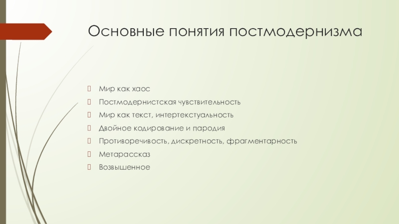Основные черты, паракатегории постмодернизма, авторы и концепты