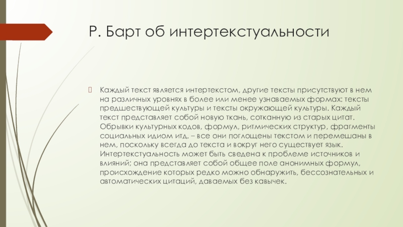 формах: тексты предшествующей культуры и тексты окружающей культуры. Каждый текст представляет собой новую ткань, сотканную из старых цитат. Обрывки культурных кодов, формул, ритмических структур, фрагменты социальных идиом итд. – все они поглощены текстом и перемешаны в нем, поскольку всегда до текста и вокруг него существует язык. Интертекстуальность может быть сведена к проблеме источников и влияний; она представляет собой общее поле анонимных формул, происхождение которых редко можно обнаружить, бессознательных и автоматических цитаций, даваемых без кавычек.