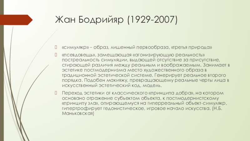 Переход эстетики от классического «принципа добра», на котором основано отражение субъектом объекта, к постмодернистскому «принципу зла», опирающемуся на гиперреальный объект-симулякр, гипертрофирует гедонистическое, игровое начало искусства. (Н.Б. Маньковская)