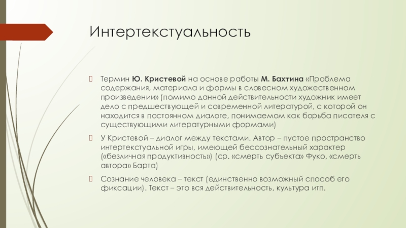 У Кристевой – диалог между текстами. Автор – пустое пространство интертекстуальной игры, имеющей бессознательный характер («безличная продуктивность») (ср. «смерть субъекта» Фуко, «смерть автора» Барта)