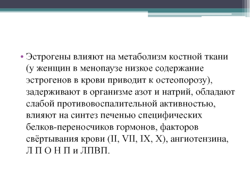 организме азот и натрий, обладают слабой противовоспалительной активностью, влияют на синтез печенью специфических белков-переносчиков гормонов, факторов свёртывания крови (II, VII, IX, X), ангиотензина, Л П О Н П и ЛПВП.