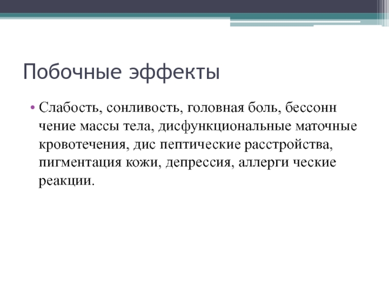 маточные кровотечения, дис пептические расстройства, пигментация кожи, депрессия, аллерги ческие