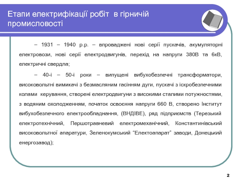 – 1917 – 1931 р.р. – створення енергетичної бази (ДРЕС за планом ГОЕЛРО), впроваджується електрообладнання у вибоях шахт: вибухобезпечні двигуни, пускачі, екрановані кабелі.