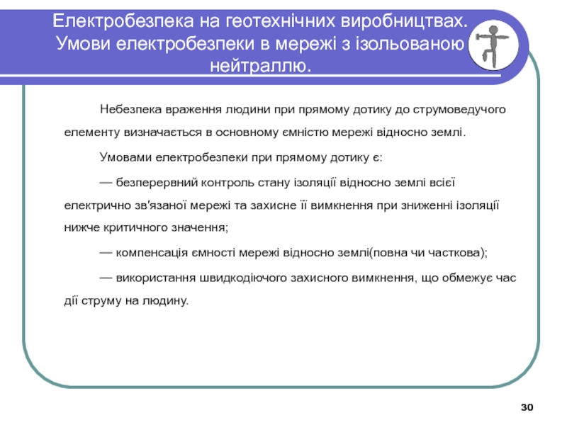 Слайд 30Електробезпека на геотехнічних виробництвах.