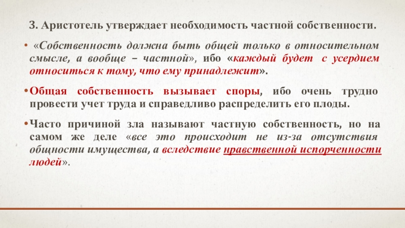 Часто причиной зла называют частную собственность, но на самом же деле «все это происходит не из-за отсутствия общности имущества, а вследствие нравственной испорченности людей».