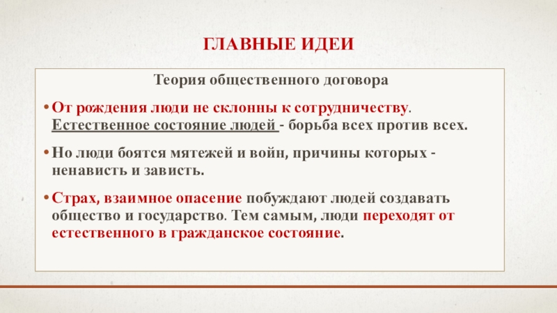 Страх, взаимное опасение побуждают людей создавать общество и государство. Тем самым, люди переходят от естественного в гражданское состояние.