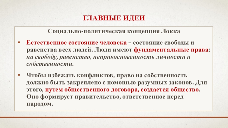 Чтобы избежать конфликтов, право на собственность должно быть закреплено с помощью разумных законов. Для этого, путем общественного договора, создается общество. Оно формирует правительство, ответственное перед народом.