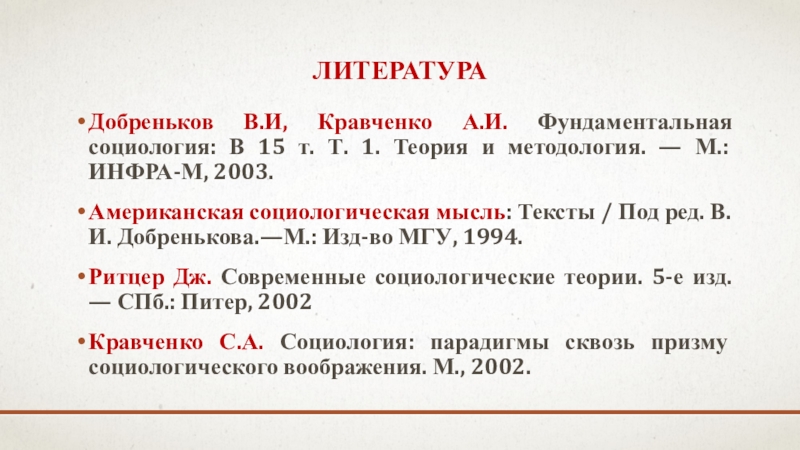 Кравченко С.А. Социология: парадигмы сквозь призму социологического воображения. М., 2002.