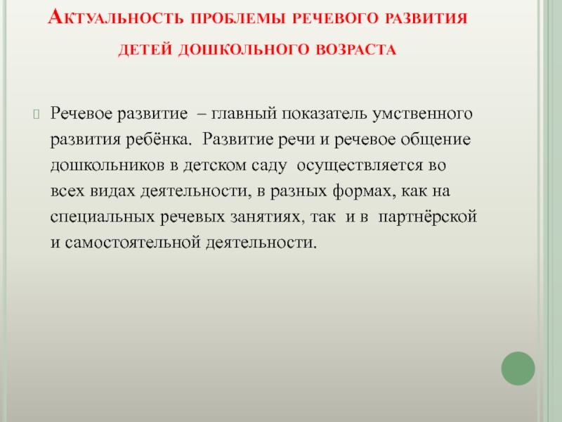 Актуальность проблемы речевого развития детей дошкольного возраста Речевое развитие – главный показатель умственного развития ребёнка.  Развитие речи и речевое общение дошкольников в детском саду  осуществляется во всех видах деятельности, в разных формах, как