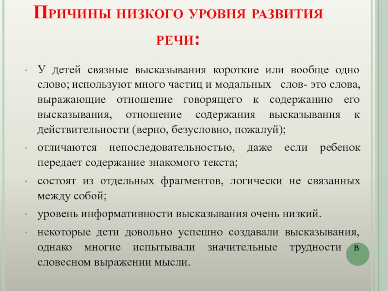 Причины низкого уровня развития речи:  У детей связные высказывания короткие или вообще одно слово; используют много