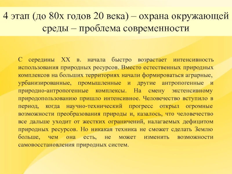 возрастает интенсивность использования природных ресурсов. Вместо естественных природных комплексов на больших территориях начали формироваться аграрные, урбанизированные, промышленные и другие антропогенные и природно-антропогенные комплексы. На смену экстенсивному природопользованию пришло интенсивное. Человечество вступило в период, когда научно-технический прогресс открыл огромные возможности преобразования природы и, казалось, что человечество все дальше уходит от жестких ограничений, налагаемых дефицитом природных ресурсов. Но никакая техника не сможет сделать Землю больше, чем она есть, не может изменить возможности самовосстановления природных систем.