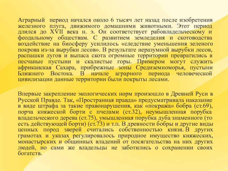 века н. э. Он соответствует рабовладельческому и феодальному обществам. С развитием земледелия и скотоводства воздействие на биосферу усилилось «следствие уменьшения зеленого покрова из-за вырубки лесов». В результате неразумной вырубки лесов, распашки лугов и выпаса скота огромные территории превратились в песчаные пустыни и скалистые горы. Примером могут служить африканская Сахара, прибрежные зоны Средиземноморья, пустыни Ближнего Востока. В начале аграрного периода человеческой цивилизации данные территории были покрыты лесами.