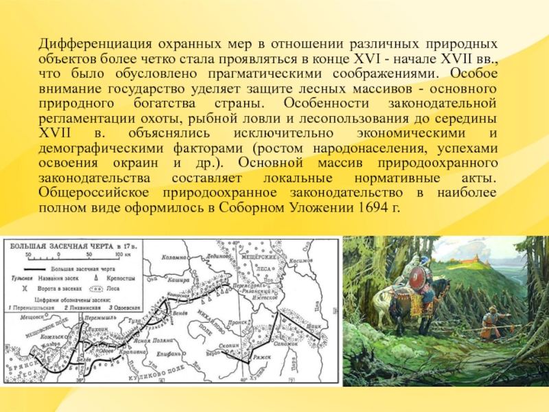 было обусловлено прагматическими соображениями. Особое внимание государство уделяет защите лесных массивов - основного природного богатства страны. Особенности законодательной регламентации охоты, рыбной ловли и лесопользования до середины XVII в. объяснялись исключительно экономическими и демографическими факторами (ростом народонаселения, успехами освоения окраин и др.). Основной массив природоохранного законодательства составляет локальные нормативные акты. Общероссийское природоохранное законодательство в наиболее полном виде оформилось в Соборном Уложении 1694 г.