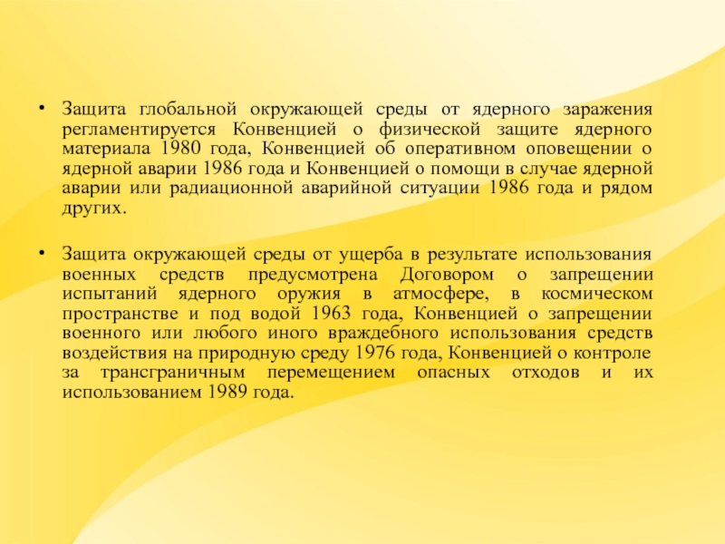 Слайд 16Защита глобальной окружающей среды от ядерного заражения регламентируется Конвенцией о