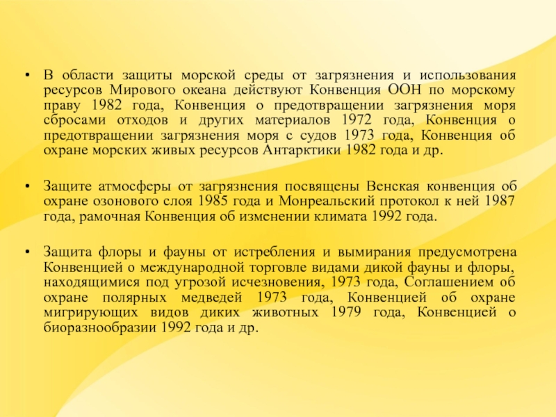 Конвенция о предотвращении загрязнения моря сбросами отходов и других материалов 1972 года, Конвенция о предотвращении загрязнения моря с судов 1973 года, Конвенция об охране морских живых ресурсов Антарктики 1982 года и др.