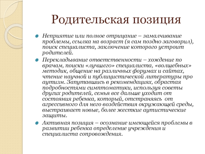 Перекладывание ответственности – хождение по врачам, поиски «лучшего» специалиста, «волшебных» методик, общение на различных форумах и сайтах, чтение научной и публицистической литературы про аутизм. Запутавшись в рекомендациях, обрастая подробностями симптоматики, используя советы других родителей, семья все дальше уходит от состояния ребенка, который, отстраняясь от агрессивного для него воздействия окружающей среды, выстраивает новые, более жесткие аутистические защиты.