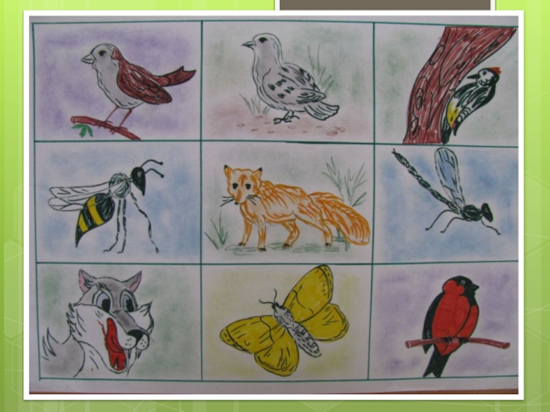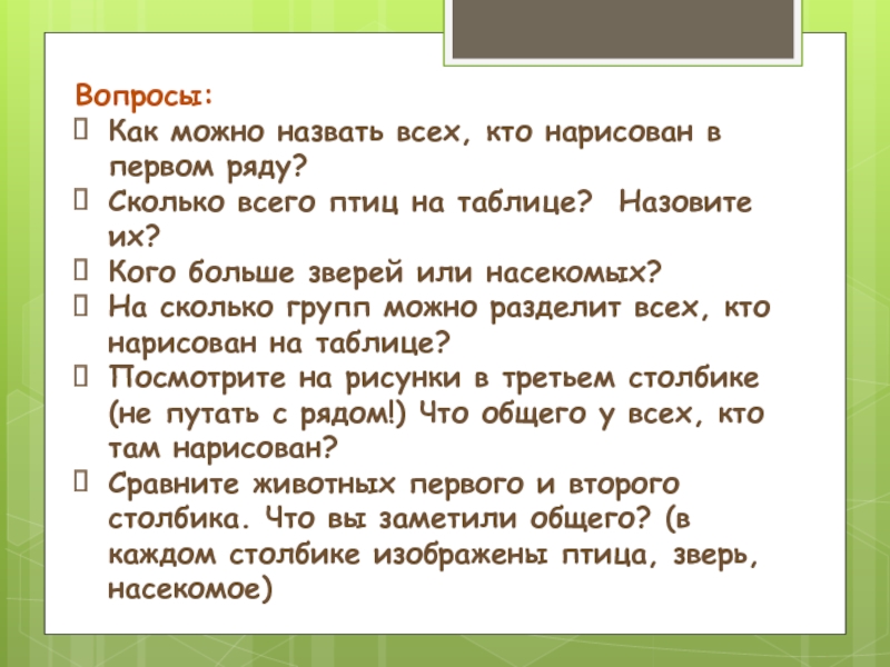 Сравните животных первого и второго столбика. Что вы заметили общего? (в каждом столбике изображены птица, зверь, насекомое)