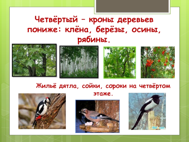 Слайд 4Четвёртый – кроны деревьев пониже: клёна, берёзы, осины, рябины.
