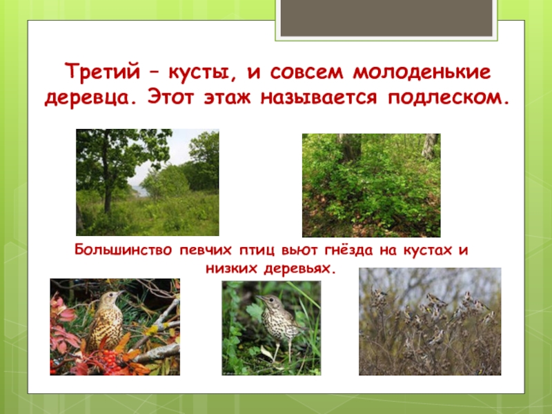 Третий – кусты, и совсем молоденькие деревца. Этот этаж называется подлеском.Большинство певчих птиц вьют гнёзда на кустах