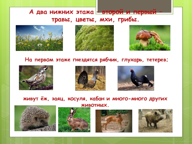 А два нижних этажа – второй и первый – травы, цветы, мхи, грибы.На первом этаже гнездятся рябчик,