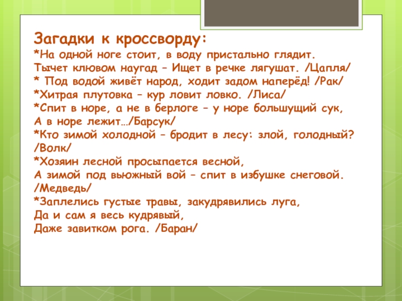 Загадки к кроссворду:*На одной ноге стоит, в воду пристально глядит.Тычет клювом наугад – Ищет в речке лягушат.