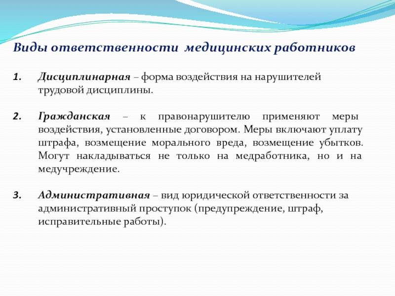 включают уплату штрафа, возмещение морального вреда, возмещение убытков. Могут накладываться не только на медработника, но и на медучреждение.
