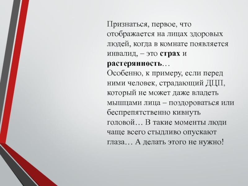 примеру, если перед ними человек, страдающий ДЦП, который не может даже владеть мышцами лица – поздороваться или беспрепятственно кивнуть головой… В такие моменты люди чаще всего стыдливо опускают глаза… А делать этого не нужно!