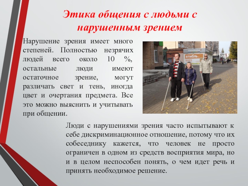 Слайд 24Этика общения с людьми с нарушенным зрением