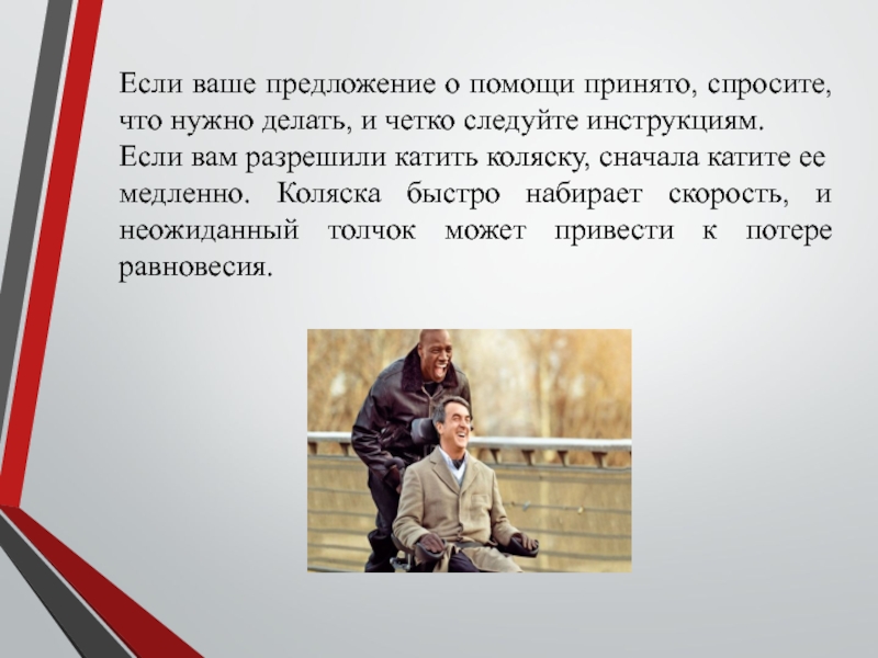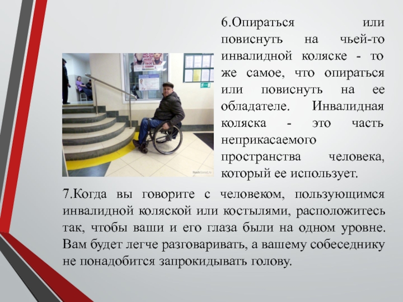 -необходимо помнить, что инвалидная коляска - это часть неприкасаемого пространства человека, который ее использует; недопустимо опираться о коляску или «повиснуть» на ней;