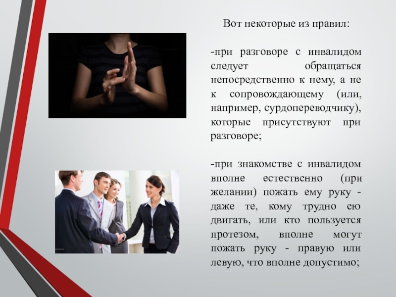 -при знакомстве с инвалидом вполне естественно (при желании) пожать ему руку - даже те, кому трудно ею двигать, или кто пользуется протезом, вполне могут пожать руку - правую или левую, что вполне допустимо;