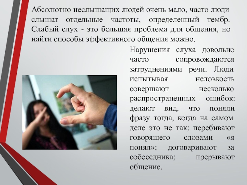 Слайд 32Абсолютно неслышащих людей очень мало, часто люди слышат отдельные частоты,
