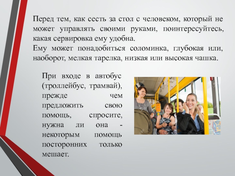 При входе в автобус (троллейбус, трамвай), прежде чем предложить свою помощь, спросите, нужна ли она - некоторым помощь посторонних только мешает.