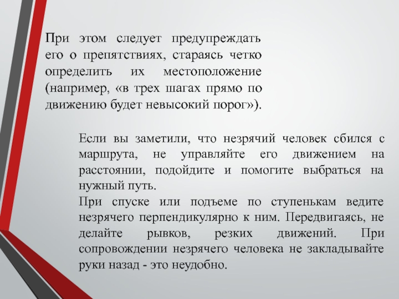 Слайд 30При этом следует предупреждать его о препятствиях, стараясь четко определить
