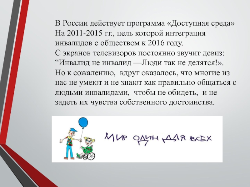 телевизоров постоянно звучит девиз: “Инвалид не инвалид —Люди так не делятся!».