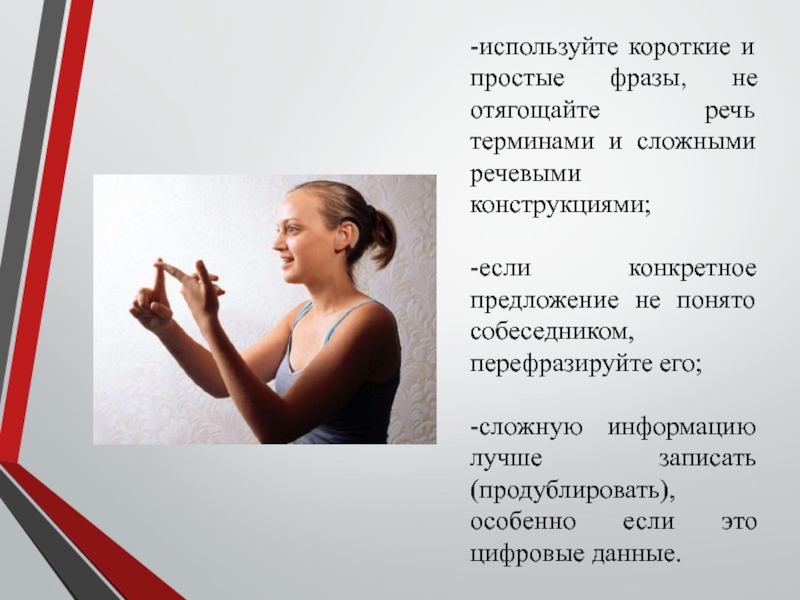 • нужно смотреть в лицо собеседника и говорить ясно и медленно, использовать простые фразы и избегать несущественных слов.