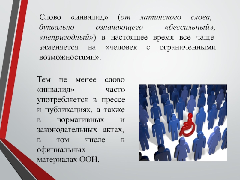 Слайд 3Слово «инвалид» (от латинского слова, буквально означающего «бессильный», «непригодный») в