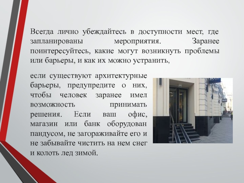 если существуют архитектурные барьеры, предупредите о них, чтобы человек заранее имел возможность принимать решения. Если ваш офис, магазин или банк оборудован пандусом, не загораживайте его и не забывайте чистить на нем снег и колоть лед зимой.