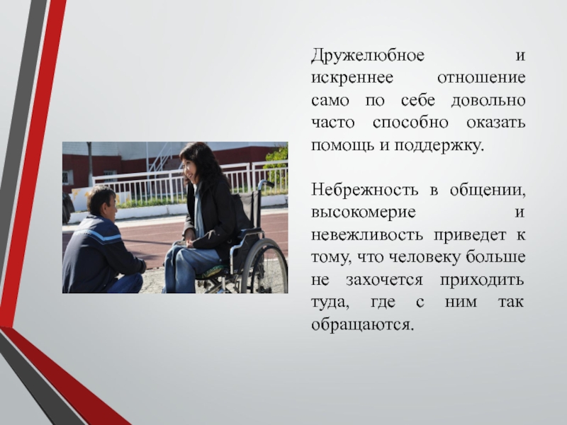 Слайд 46В общении с людьми с ограничениями здоровья будьте спокойны и