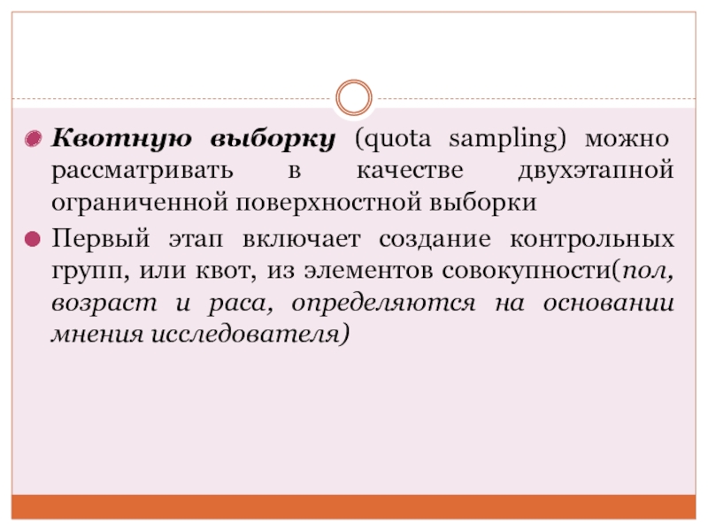 Слайд 20Квотную выборку (quota sampling) можно рассматривать в качестве двухэтапной ограниченной
