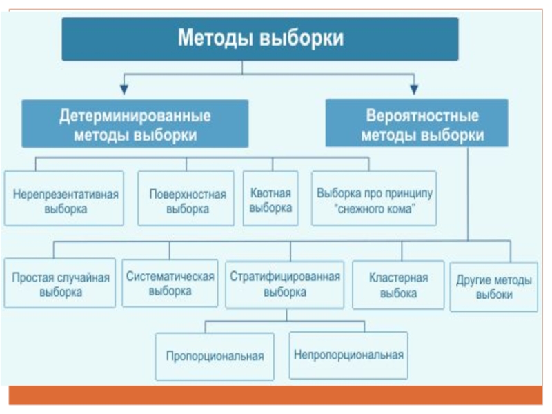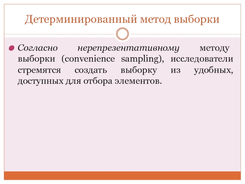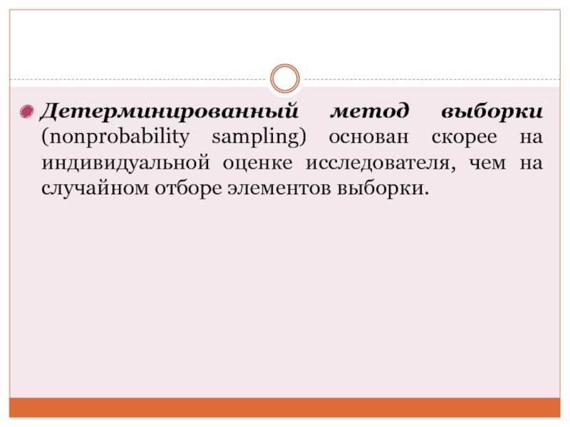 Слайд 15Детерминированный метод выборки (nonprobability sampling) основан скорее на индивидуальной оценке
