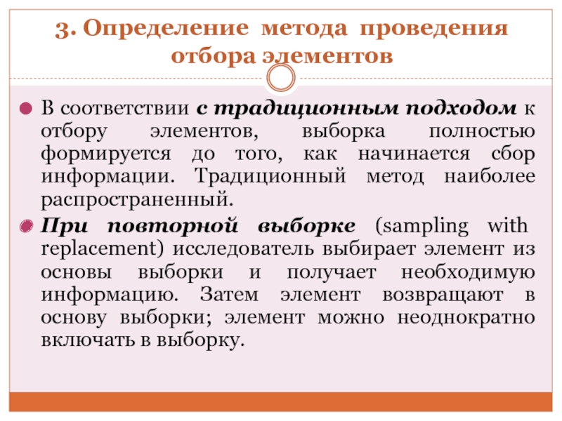 При повторной выборке (sampling with replacement) исследователь выбирает элемент из основы выборки и получает необходимую информацию. Затем элемент возвращают в основу выборки; элемент можно неоднократно включать в выборку.