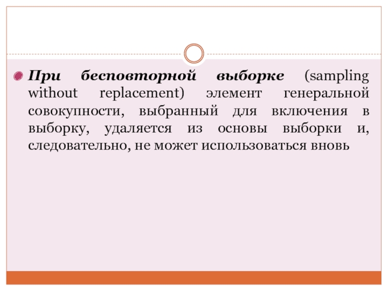 Слайд 11При бесповторной выборке (sampling without replacement) элемент генеральной совокупности, выбранный