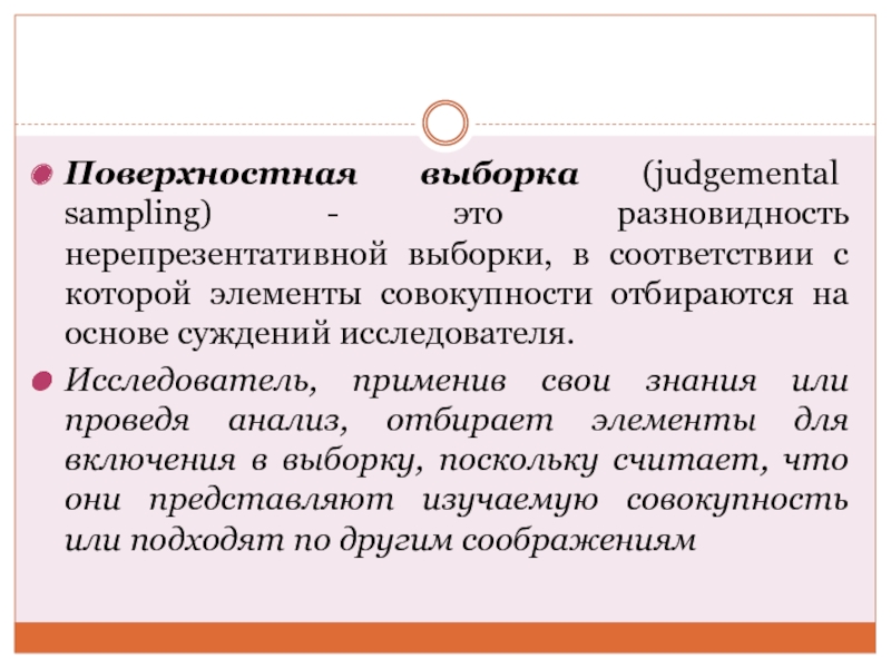 Слайд 19Поверхностная выборка (judgemental sampling) - это разновидность нерепрезентативной выборки, в